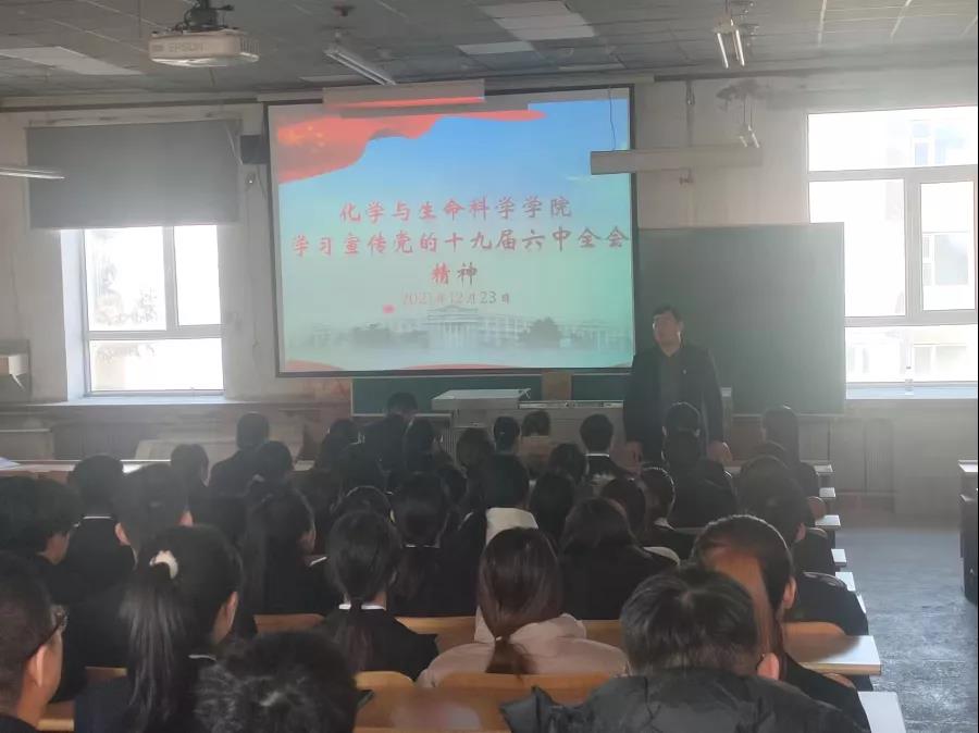 党委书记于洪,党委副书记徐秉锋两位老师主讲。两位老师对党的十九届六中全会精神内容进行了总结与叙述:一是通过中国共产党第三次历史决议;二是强调了两个确立;三是进一步概括了习近平新时代中国特色社会主义思想;四是十个坚持总结建党百年奋斗历史经验;五是文化建设取得重大历史性成就;六是高质量发展中推进共同富裕。此外,老师们也介绍了党的百年奋斗历程和历史经验,使同学们对党的十九届六中全会精神有了更深入的理解。