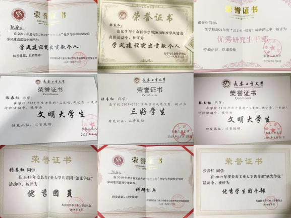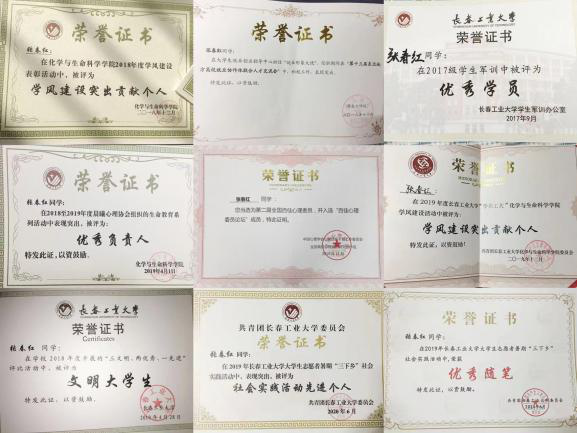 学院大学生心理工作委员会会长,关心集体,能够及时反映情况,在同学中有较高的号召力,作为主负责人举办了心理剧大赛、生命健康心理系列活动、“冬至暖阳”送信活动等15项活动,曾带领团队参与关爱自闭症儿童志愿者服务等,既锻炼了交际能力,又增长了社会经验,特此荣获第二届全国“百佳心委”荣誉称号、第五届长春工业大学“工大之星”荣誉称号、校“文明大学生”、校“优秀学生干部”、校“优秀研究生干部”、校“优秀团干部”、校“优秀团员”等荣誉称号20余次;