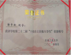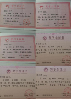 在校期间,曾获得2次国家励志奖学金,9次学业奖学金,3次单科状元;获得2020年度“长春市优秀共青团员”称号、长春工业大学第二十二届“十佳自立自强大学生”、获得校第十六期青马班培训“优秀学员”、校“文明大学生”荣誉称号、校“优秀团干部”、校“优秀团员”,院“优秀学生干部”“学风建设突出贡献个人”等。在学院内开展学习经验分享会,分享学习心得,考研心得,帮助学弟学妹们复习方向及方法,激发同学们学习的热情。