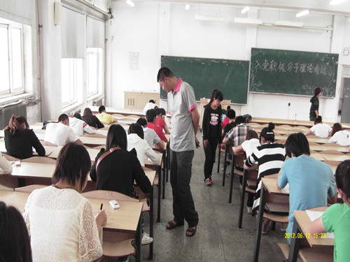 于6月12日16时在综合楼第五阶梯教室举行了入党积极分子理论考试。学院学生党支部书记于伟,校学生会副主席王路,院团委副书记哈林丹妮,学生会主席侯国奇,社联主席郑博莅临了考试现场。