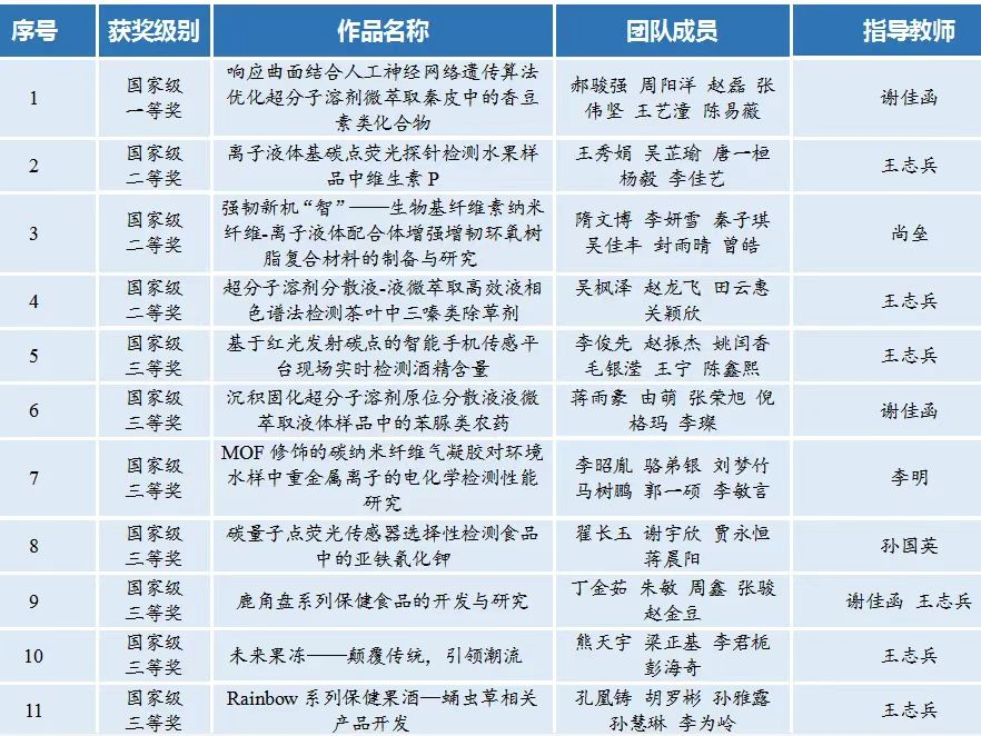 谢佳函老师指导,郝骏强同学带领的《响应曲面结合人工神经网络遗传算法优化超分子溶剂微萃取秦皮中的香豆素类化合物》荣获国家级一等奖,由尚垒老师指导、隋文博同学带领的《强韧新机“智”——生物基纤维素纳米纤维-离子液体配合体增强增韧环氧树脂复合材料的制备与研究》等3项作品荣获国家级二等奖,由孙国英老师指导、翟长玉同学带领的《碳量子点荧光传感器选择性检测食品中的亚铁氰化钾》等7项作品荣获国家级三等奖。另荣获省级二等奖4项、三等奖9项。