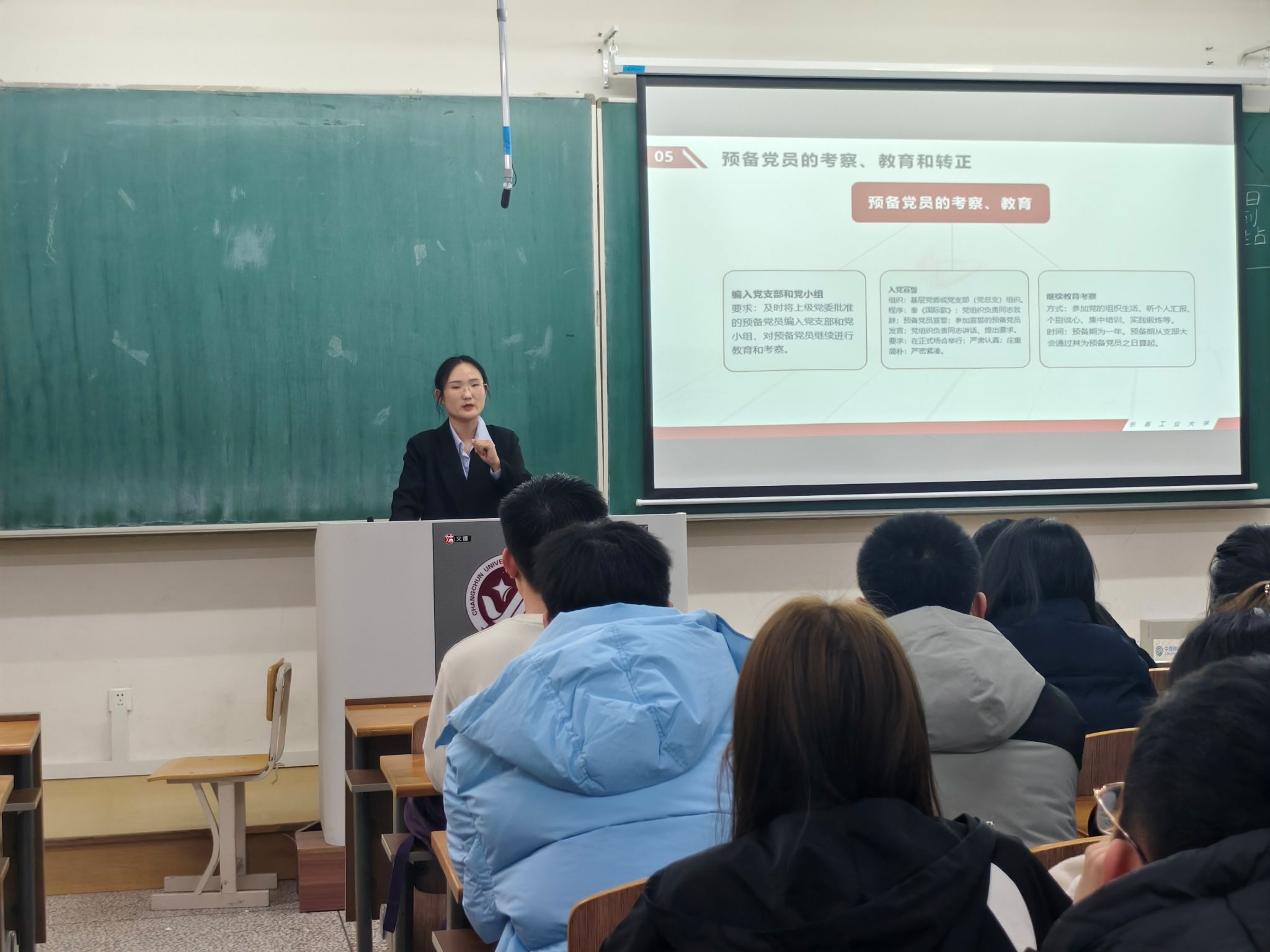 本次培训班围绕党的二十大、党的二十届三中全会精神、《中国共产党章程》以及党的基础知识展开学习。此次培训采取集中授课、视频教学相结合的形式进行。培训课上,刘扬老师以“高举旗帜谋发展 深入学习贯彻两会精神”为题,围绕“回顾成就凝聚信心总结经验启迪未来”、“明确目标坚定方向把握大势勇毅前行”、“聚焦重点精准发力夯实基础推动落实”、“不忘初心牢记使命苦干实干开创未来”四个方面向同学们具体介绍了2025年全国两会精神。李秀绒老师以“如何做一名向党组织靠拢的青年”为题,向同学们讲授了党员的具体发展流程,提出:积极分子需要定期向党组织汇报自己的思想、学习和工作情况,主动接受党组织的考察。在这个过程中,参加党组织安排的党课学习、集中培训等活动至关重要。