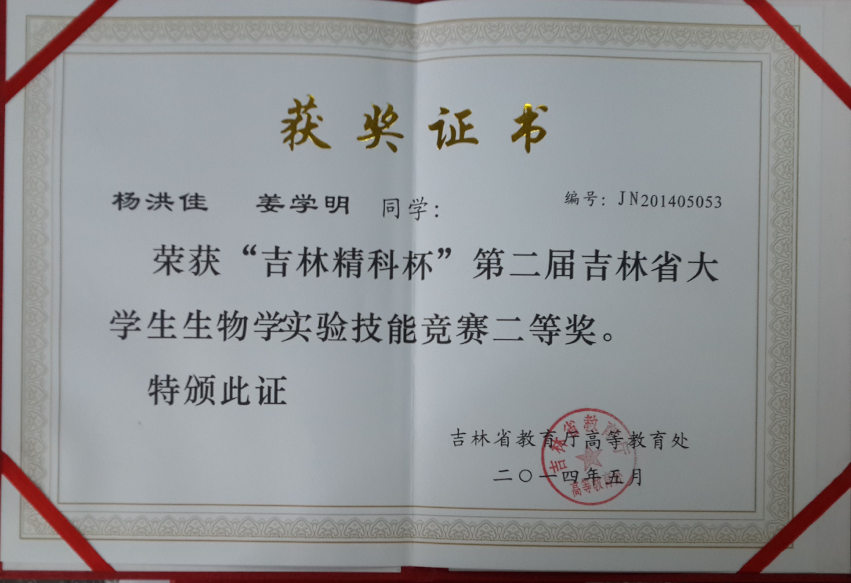 2014年“吉林精科杯”吉林省第二届大学生生物学技能竞赛二等奖(二)