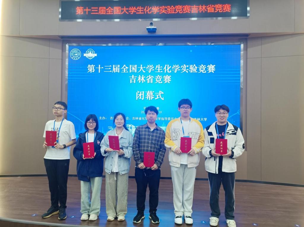 教师关爽、武原琪指导我校6名同学参加比赛,全部获奖,成绩优异。其中,22级周靖林同学获得一等奖,22级李威萱,韩旭荣,张伟益,梁郝四名同学获得二等奖,21级崔佳雪同学获得三等奖。获得一等奖的周靖林同学将代表吉林省参加第十三届全国大学生化学实验竞赛(省赛选拔5名同学参加国赛)。