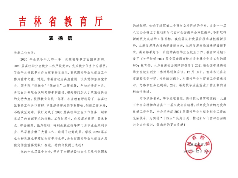 新闻网讯(通讯员 田兵)近日,学校收到吉林省教育厅表扬信,对学校征兵工作提出表扬。信中指出:2020 年征兵工作启动以来,长春工业大学认真贯彻国务院、中央军委征兵命令和省征兵工作领导小组会议精神,在省委、省政府的正确领导下,在省军区、省教育厅具体指导下,主动克服疫情带来的不利影响,将工作关口前移,创新工作方法,不断攻坚克难,超额完成了 2020 年大学生征兵工作任务。工作过程中,学校高度重视,领导靠前指挥、亲自调度,征兵工作部门加大动员力度,强化服务保障,做了大量卓有成效的工作,超额完成了年度大学生征集任务,为全省高校大学生征兵工作作出重要贡献!在此,特向你校提出表扬!