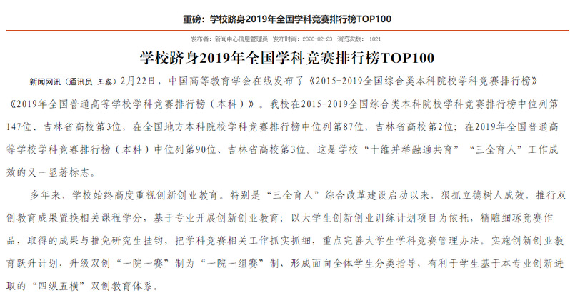 学校成为“吉林省特色高水平应用研究型大学”建设项目高校,开展思想大讨论,凝聚思想共识,汇聚发展力量。在校学生总数达到23053人,其中博士研究生127人、硕士研究生2895人、本专科学生20021人。全面启动“十四五”规划编制工作,形成“一总十分”框架。学校进入一个崭新的历史阶段和发展方位,事业蓬勃发展的良好势头昂扬正浓。