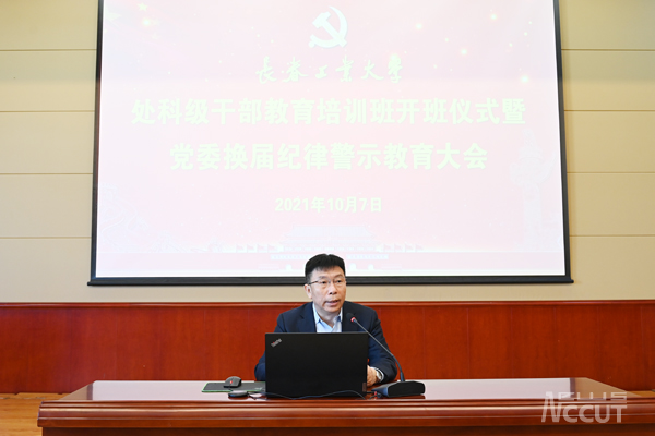 新闻网讯(通讯员 祝盛)10月7日,学校处科级干部教育培训班开班仪式暨党委换届纪律警示教育大会在南湖校区学术报告厅召开。学校领导、全体中层干部参加了会议,科级干部通过企业微信同步观看直播。会议由党委副书记孟雷主持。