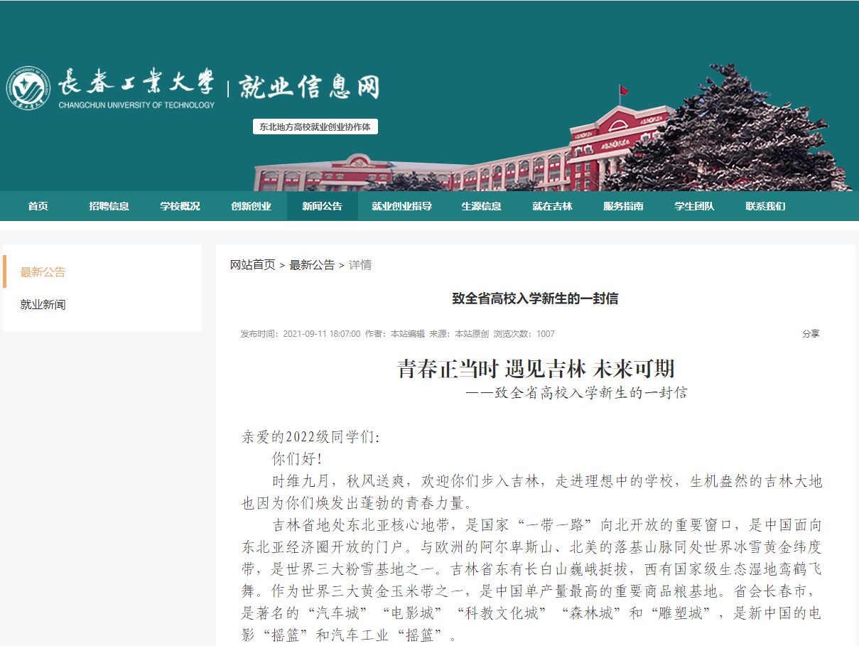 二是传达一封写给新生的信。学校通过校院两级网站、微信公众号面向全体新生和家长推送了《青春正当时 遇见吉林 未来可期—致全省高校入学新生的一封信》和《长春工业大学致全体新生家长的一封信》,以深情的笔触,表达了对同学们在吉林大地一展身手、建功立业、实现梦想,书写无悔青春的殷切期望,如暖流入心,似春风拂面,极大地激发了同学们留省就业创业的热情。大家纷纷表示,两封信的内容句句饱含深意,字字充满期望,阅读以后备感振奋,更加明晰了成长方向,在接下来的大学生活中,将珍惜宝贵年华、树立报国之志、练就实干之功,成为吉林全面振兴全方位振兴的生力军。