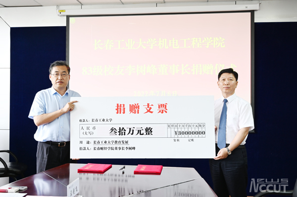 新闻网讯(通讯员 郑洪斌 张亮亮)7月6日下午,在学校建校七十周年即将到来之际,机电工程学院83级校友、长春财经学院董事长李树峰为学校捐赠资金30万元,用于学校七十周年校庆和教育事业发展。学校在南湖校区办公楼五楼会议室举行了捐赠仪式。长春财经学院党委书记郭立东出席仪式。学校党委书记孙长智、校长张明耀热情接待了李树峰校友一行。党委副书记李东玲主持仪式。校庆办相关人员、机电工程学院党政负责人参加仪式。